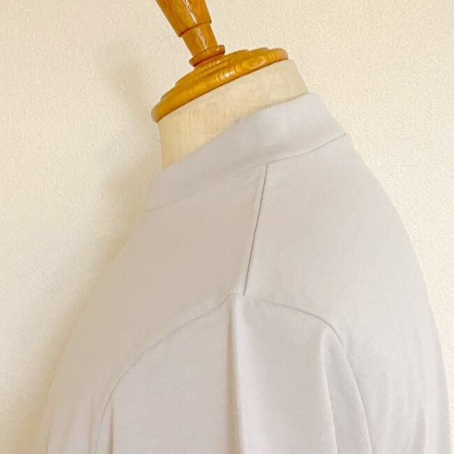 ジャケットやシャツとの着合わせを考慮してデザインされたユーティリティドレスTシャツは、衿を後ろ側だけ高くすることで羽織りものと首との接触を避け、衿元の汚れを防ぐ効果があります。ジャケットやシャツのラインを崩さないコンパクトなサイズ感も魅力のひとつです。日本製。