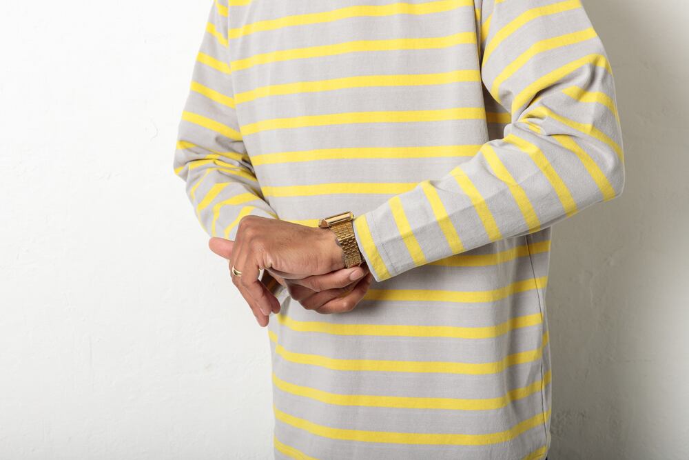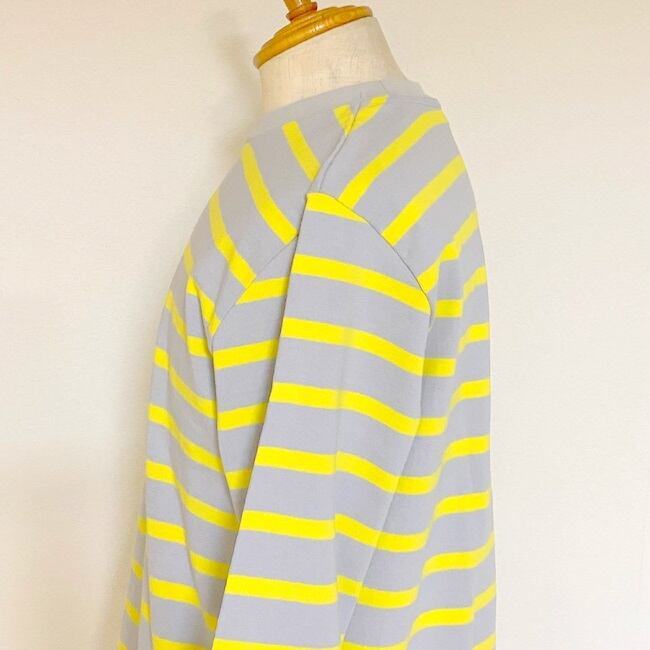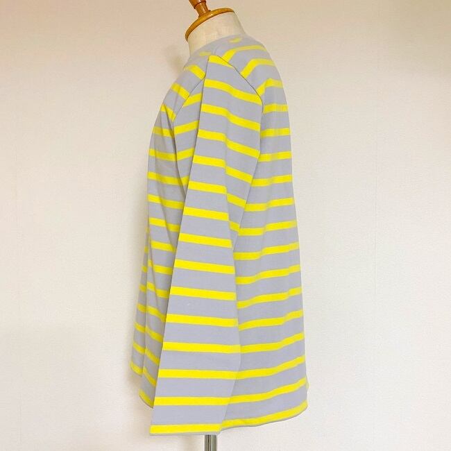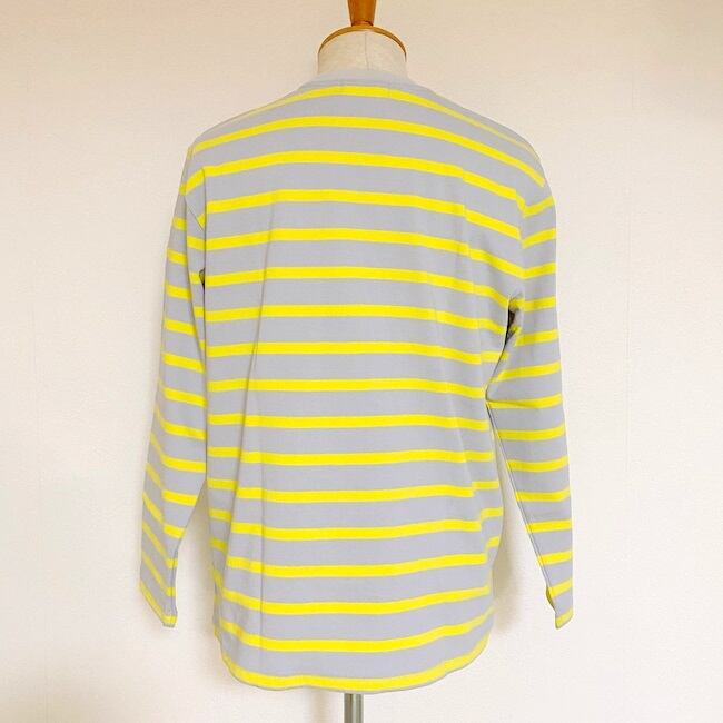 程よいゆとりを入れ、ストレスを感じないサイズ感に設定。1枚着としてもインナーとしても使い勝手が良いアイテムで、ロングシーズン楽しめる1枚。グレーボディーにイエローのラインが新鮮で美しいボーダーカットソーです。日本製。