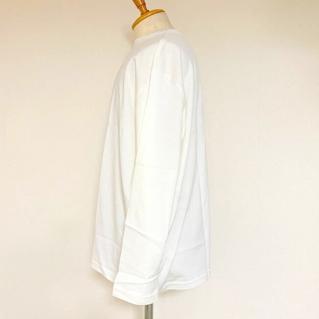 ソフト仕上げのコットン素材を使用したカーブシルエットのロングスリーブカットソー。たっぷりと生地を使い、両脇をカーブさせた特殊なシルエットでふくらみのある身頃のデザインに仕立てました。シンプルな無地でも個性的な着こなしが楽しめるデザイントップスです。日本製。
