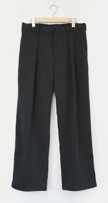 裾にはダーツを入れることで、通常のスラックスパンツとは違ったこなれ感のあるシルエットを実現しています。どんなアイテムとも相性が良いのでベーシックスタイルからストリートスタイルまで幅広い着こなしに対応できる万能アイテムです。