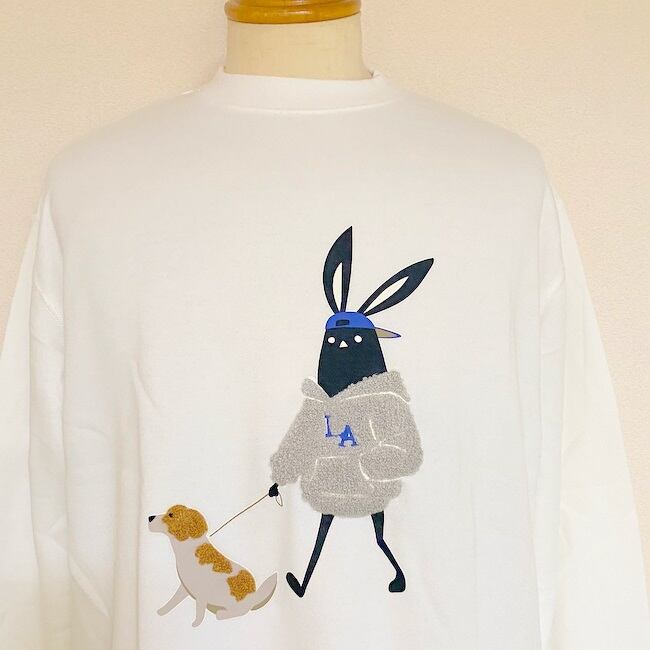 犬と散歩を楽しむシャビー。プリントとサガラ刺繍を組み合わせたデザイン