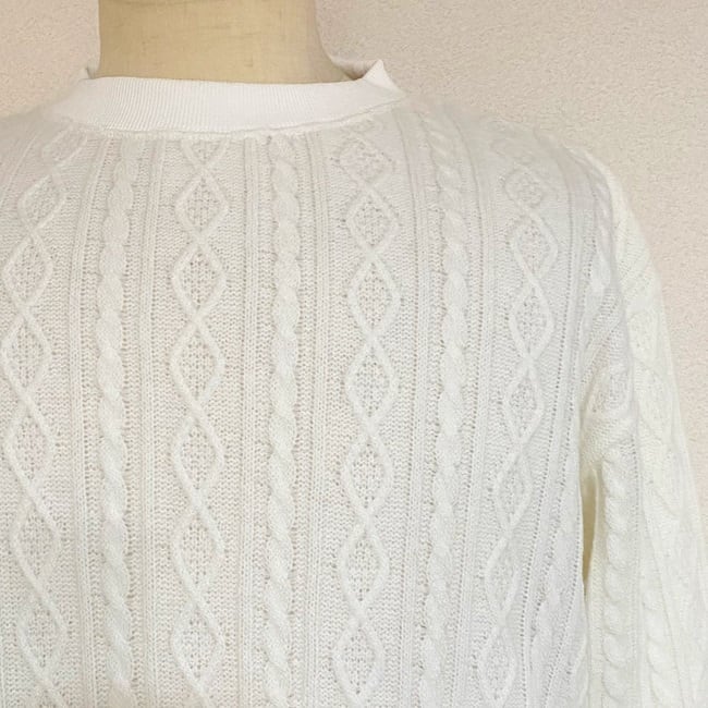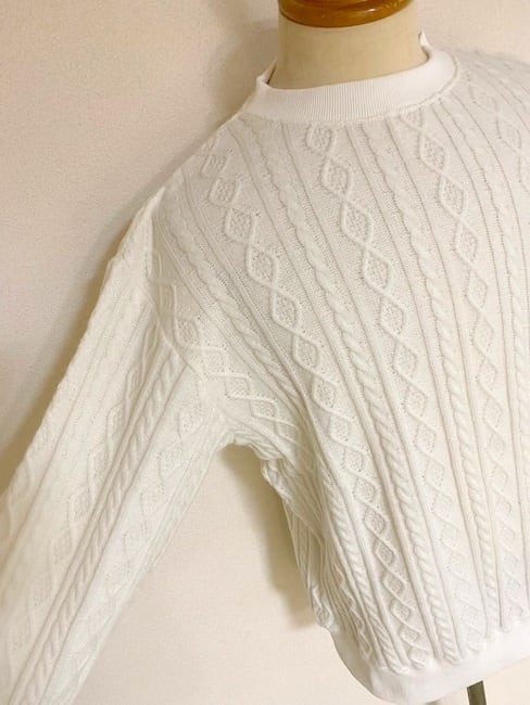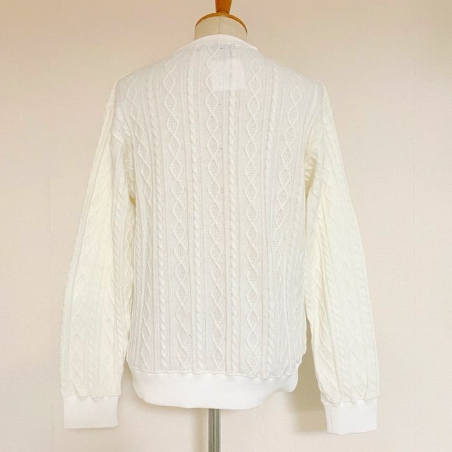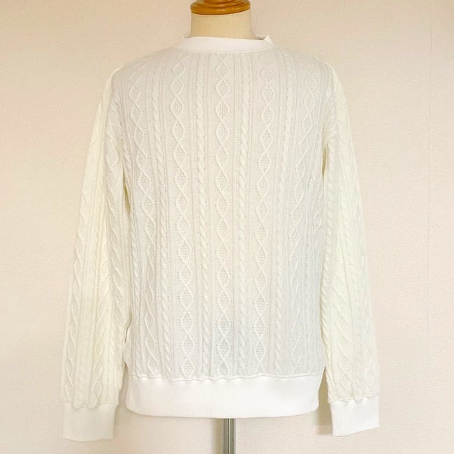ケーブル柄をジャガードで編みたてたニットライクなカットソー素材を使用しています。ネック、袖口、裾をリブ編みに切り替えて仕立てることでスウェットシャツのようなフォルムと着心地に仕立てています。スウェット感覚な気軽さでニット風のお洒落感をまとえるアイテム。