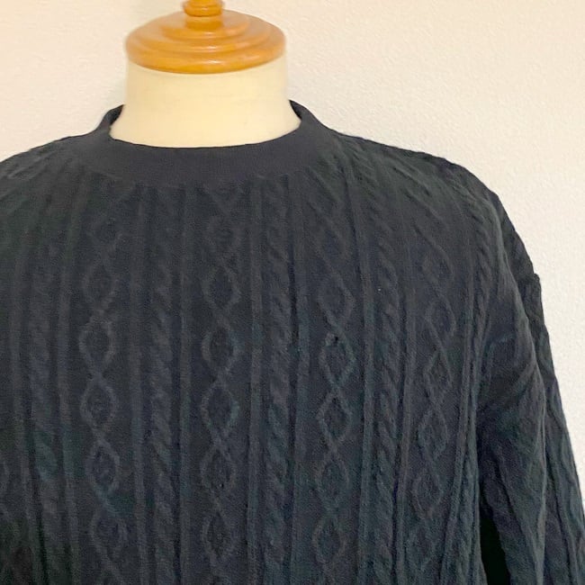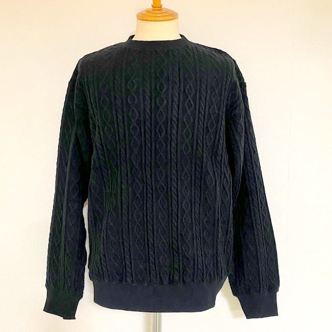 ケーブル柄をジャガードで編みたてたニットライクなカットソー素材を使用しています。ネック、袖口、裾をリブ編みに切り替えて仕立てることでスウェットシャツのようなフォルムと着心地に仕立てています。スウェット感覚な気軽さでニット風のお洒落感をまとえるアイテム。