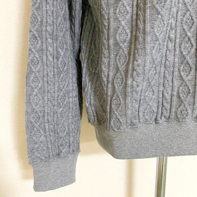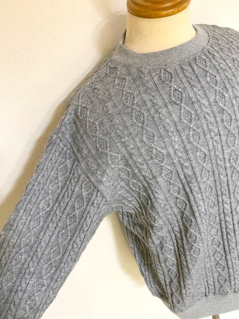 ケーブル柄をジャガードで編みたてたニットライクなカットソー素材を使用しています。ネック、袖口、裾をリブ編みに切り替えて仕立てることでスウェットシャツのようなフォルムと着心地に仕立てています。スウェット感覚な気軽さでニット風のお洒落感をまとえるアイテム。