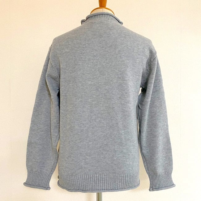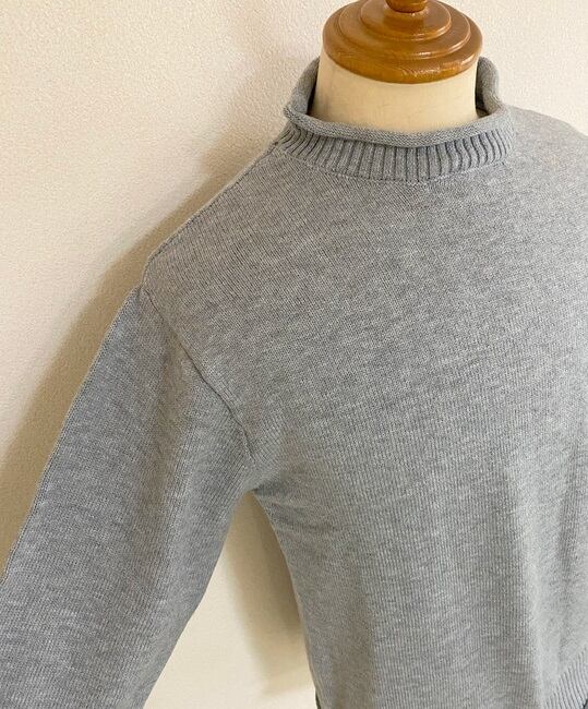 ネックと裾、袖口がリブ編みに切り替わって、くるっと丸まったロール状になっているのが特徴的なニット。