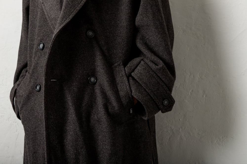 ダブル仕立てでたっぷりと取った着丈、アームホールでリラックス感溢れるシルエットです。