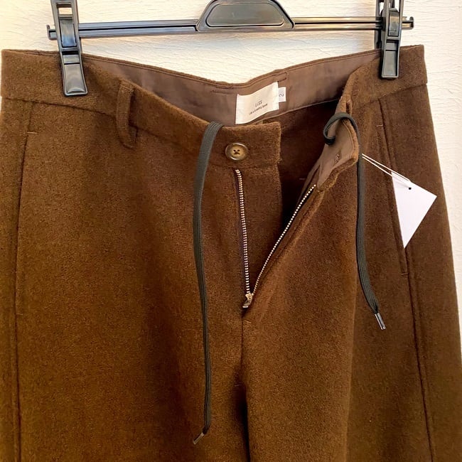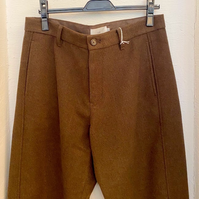 ソフトな風合いでシーズンムードを高めるウール調のTR素材を使用したスラックスパンツ。ヒップから腿はゆとりを持たせながら裾にかけてややテーパードしたシルエット。