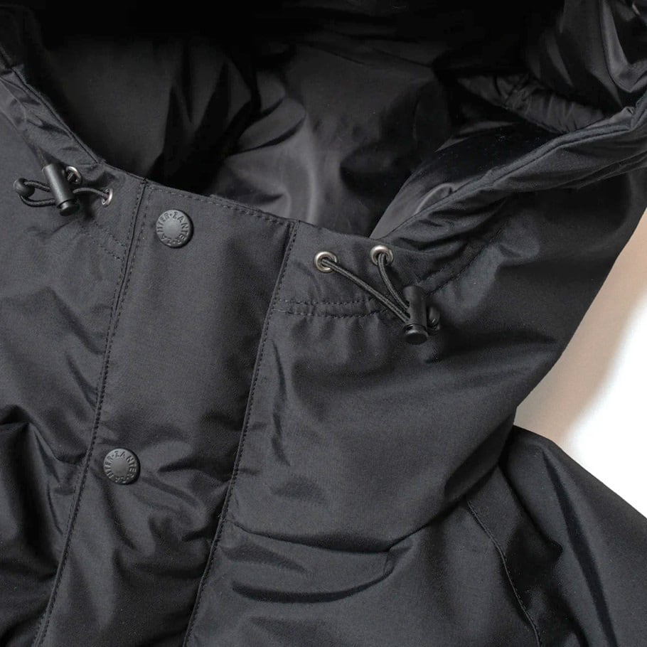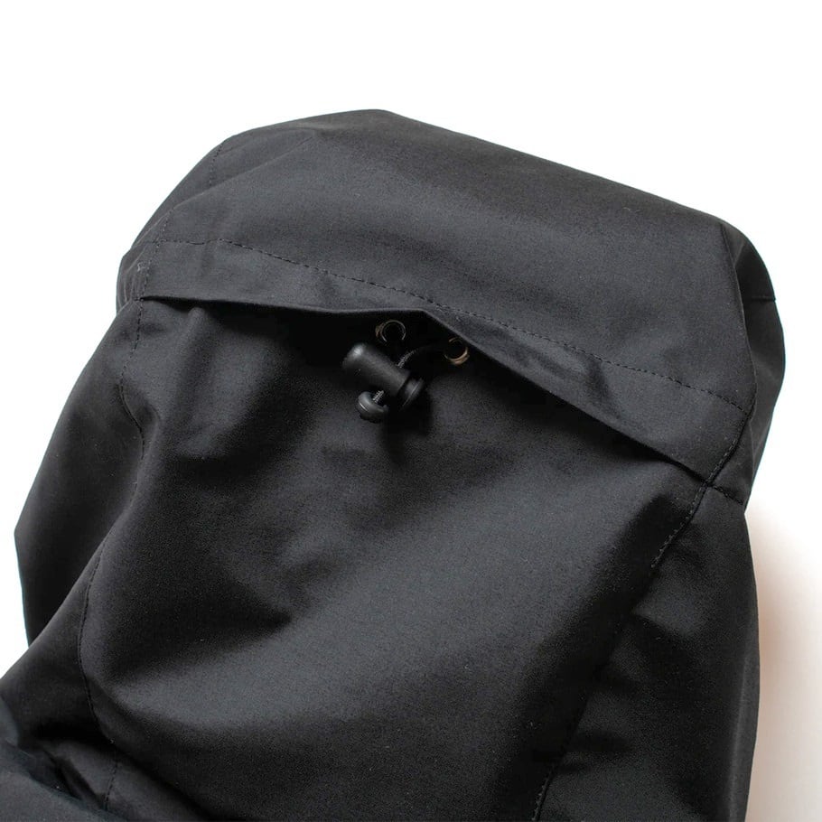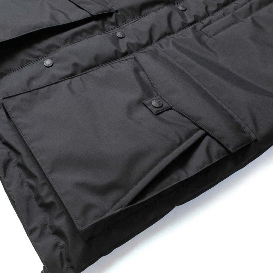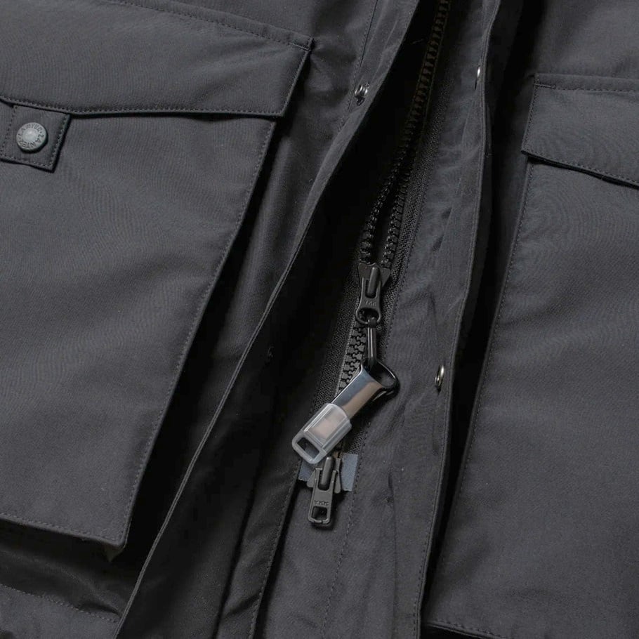 風や雨雪の侵入を防ぐダブルフロント仕立てや、ヘルメットを着用したままでも被れる大きなフード、手袋の上からしっかり被せ、マジックテープでがっちり止められられるよう広めにとられた袖口など、極寒地仕様ならではのこだわりが満載。