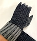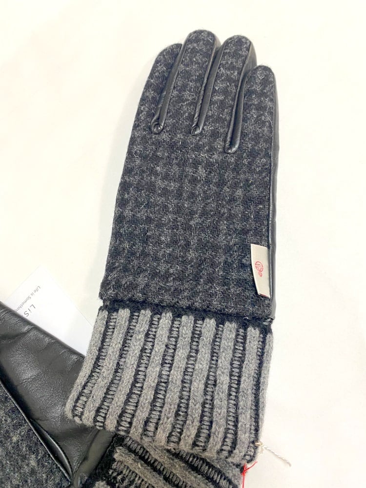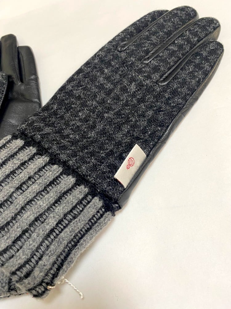 ラムレザーとハリスツイードの千鳥格子柄ウール素材が切り替わったグローブ。手首部分はリブ編みニットに切り替わっています。裏地にはフリース生地が配されていて肌触りもよく保温力も抜群です。人差し指がスマートフォンやタブレットのタッチパネルに対応した仕様になっています。日本製。