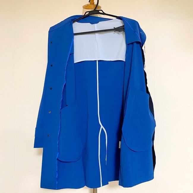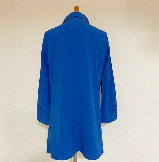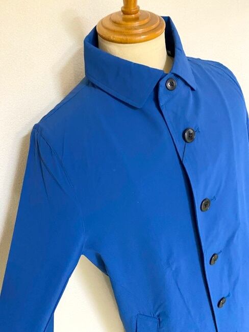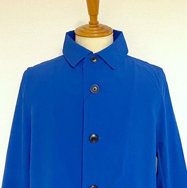 縦横共にナイロン/ポリウレタン糸を使用して伸縮性に優れた素材を使用したステンカラーコート。ハリコシがあり、ナイロン特有のサラッとしたドライタッチとマットなルックスが特徴で、接触冷感機能もあります。