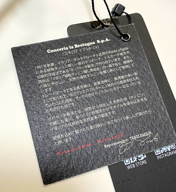 ※バケッタ製法とは、植物から抽出した天然の渋(タンニン)で鞣した革に、ゆっくりと時間をかけてオイルを染み込ませる、イタリアの伝統的な天然皮革の製法です。