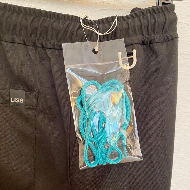 ウエストに挟み込んだLiSSオリジナルのDカンがアクセントに効いています。ウエストのコードにはホワイトカラーのスピンドルを通していますが、セットでネオンカラーのスピンドルが付属しています。好みで付け替えが楽しめます。