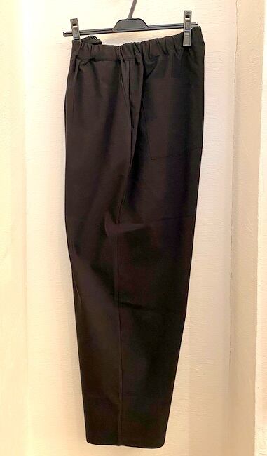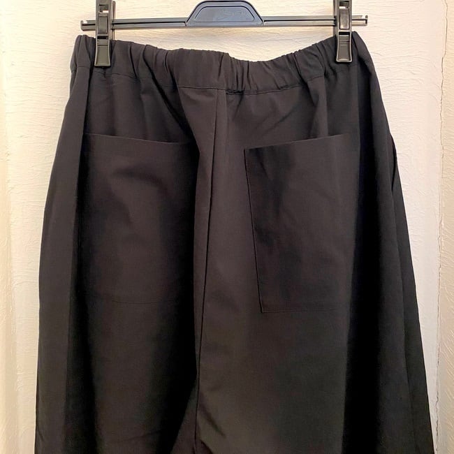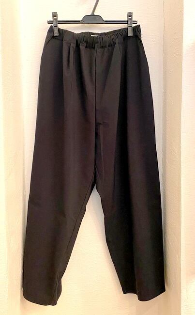 ウエストベルトがヒップサイズまで伸び、たっぷりとギャザーの入ったイージーパンツ。