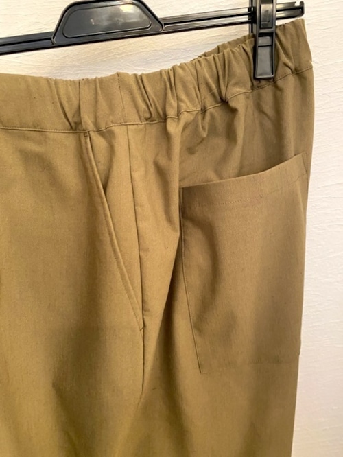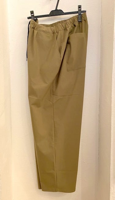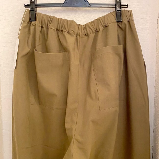 ウエストベルトがヒップサイズまで伸び、たっぷりとギャザーの入ったイージーパンツ。