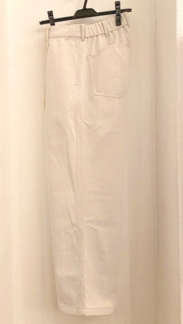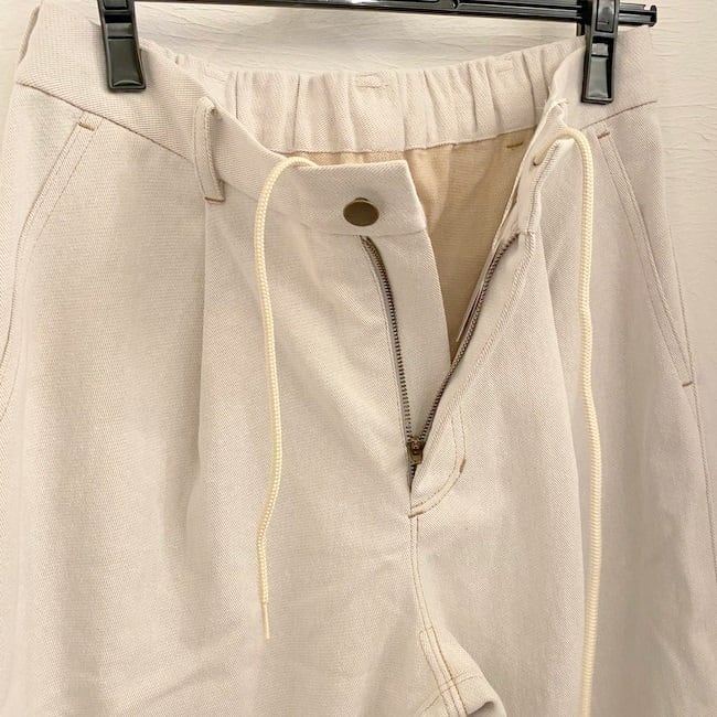 ワンウォッシュしたデニムは軽く柔らかで、ごわつきなく着用することができます。腰回りに入れたタックでゆとりを出し、ウエストは背面をゴム仕様にすることでイージーな履き心地に仕立てました。