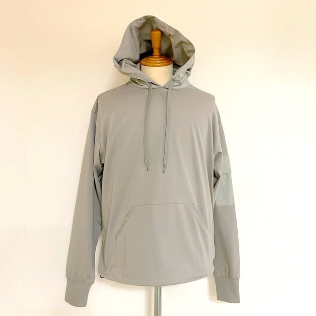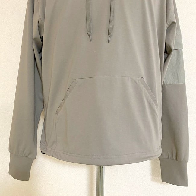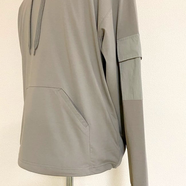フード・袖ポケット・マフポケット縁にカットソー部分と同色の布帛生地を使用したデザインカットソープルオーバーパーカー。裾にはドローコードが入っているので、タックイン風の着こなしも楽しめるようになっています。