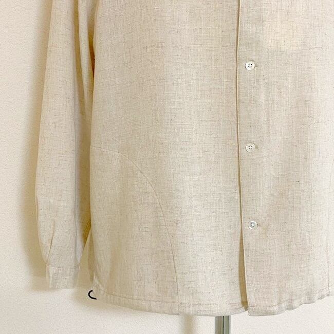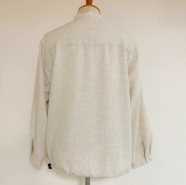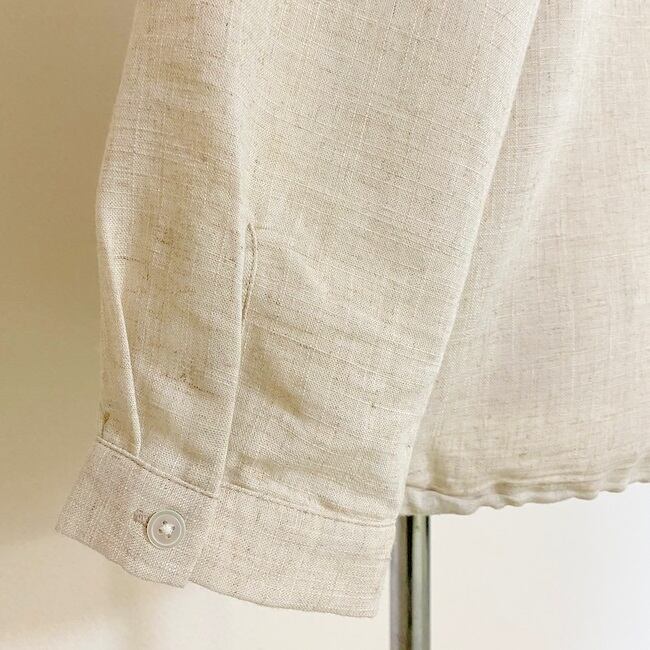 凹凸感のあるスラブ糸とナチュラルな風合いのリネン糸で織布されたヴィンテージ感漂うブロード生地を使用したバンドカラーシャツカーディガン。