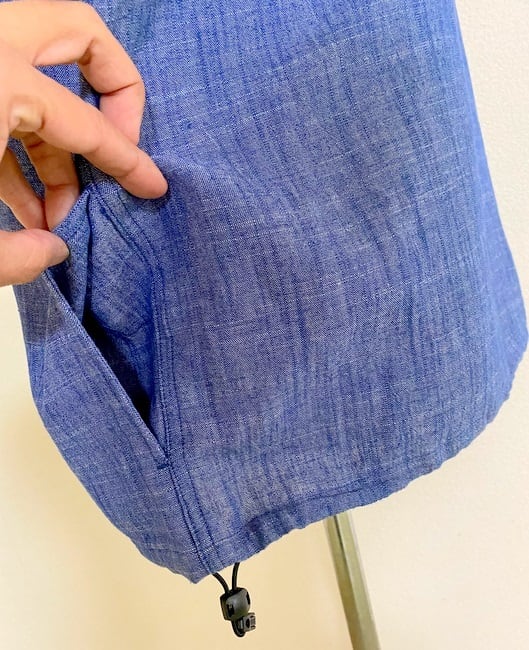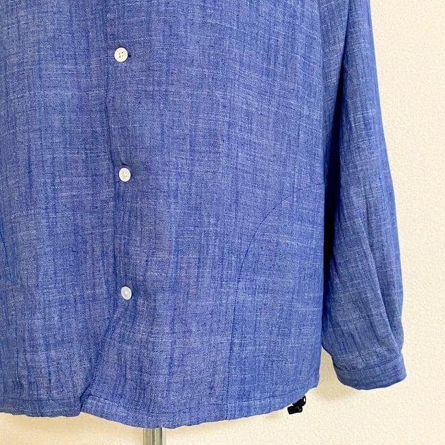 裾にドローストリングコードを配しているのでタックイン風な着こなしも可能。両サイドにはポケットを配しています。シャツとしてだけでなく、カットソー(Tシャツ)にパッと羽織るだけのカーディガン感覚にも使えるアイテムに仕上げた1枚です。