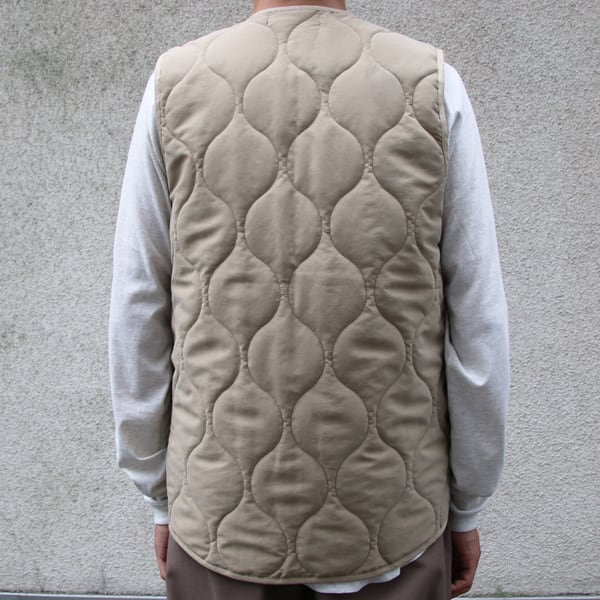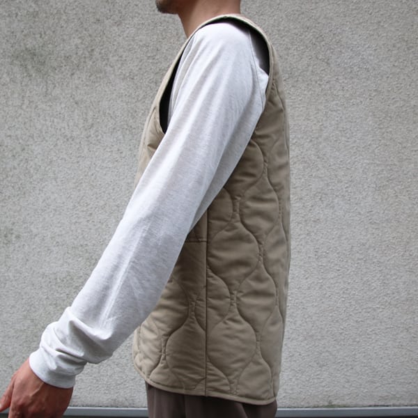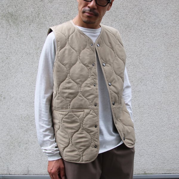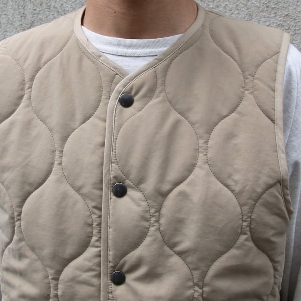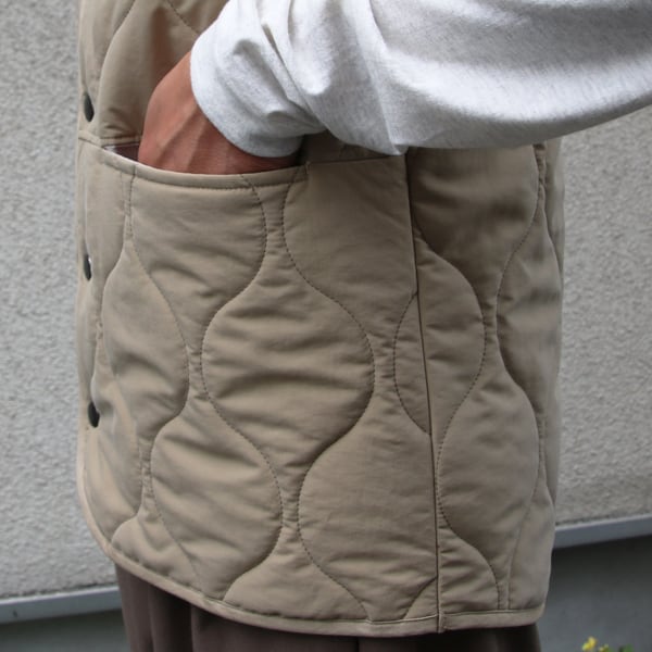 ミリタリーアウターのライナーに起用されているウェーブキルトのスナップベスト。