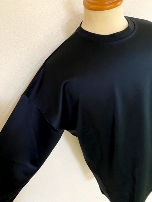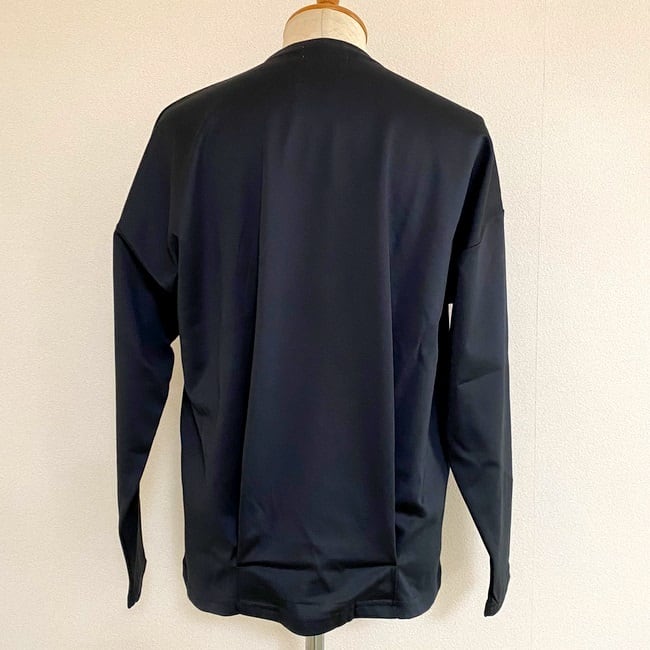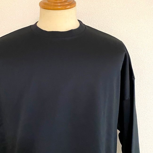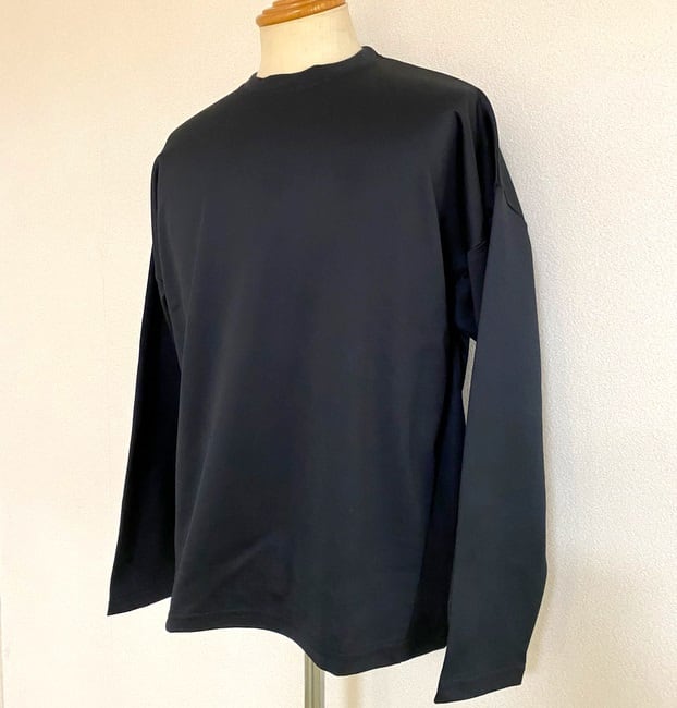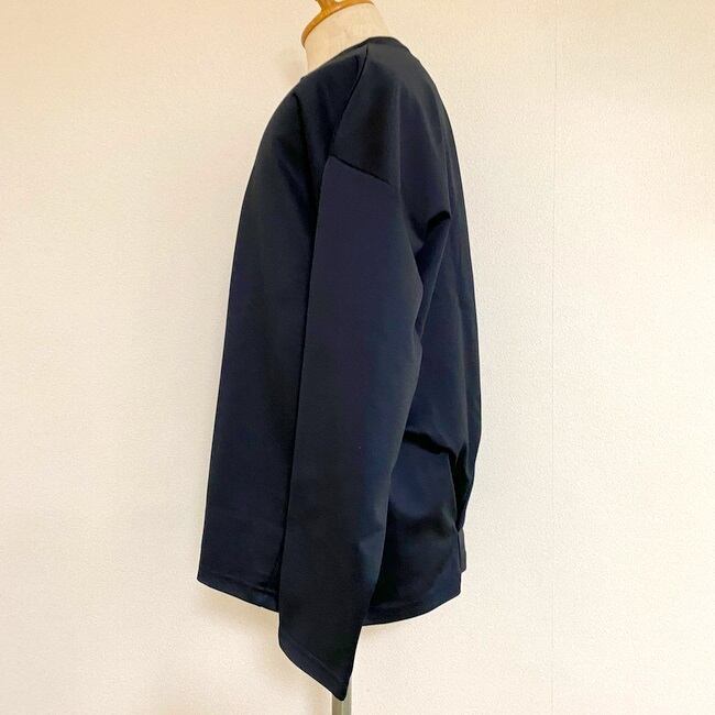 前から見るとシンプルなロングスリーブカットソーですが、後ろ見頃の裾にタックを入れることで、着用したときにナチュラルな膨らみが出るようにしたデザインです。