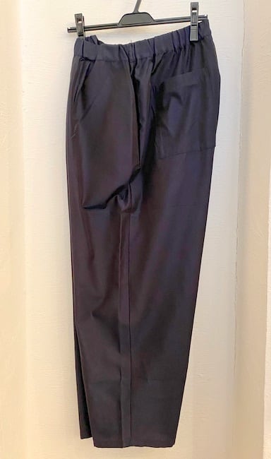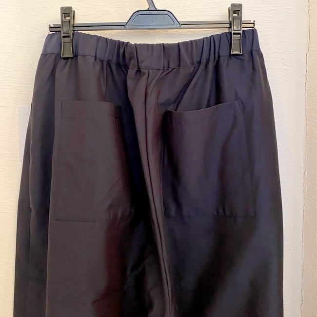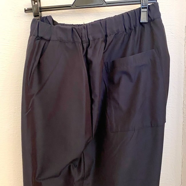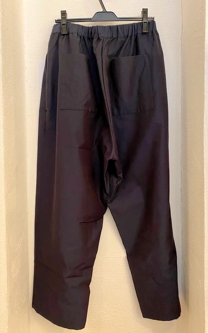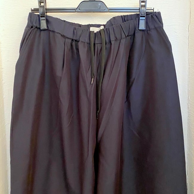 ウエストベルトがヒップサイズまで伸び、たっぷりとギャザーの入ったイージーパンツ。