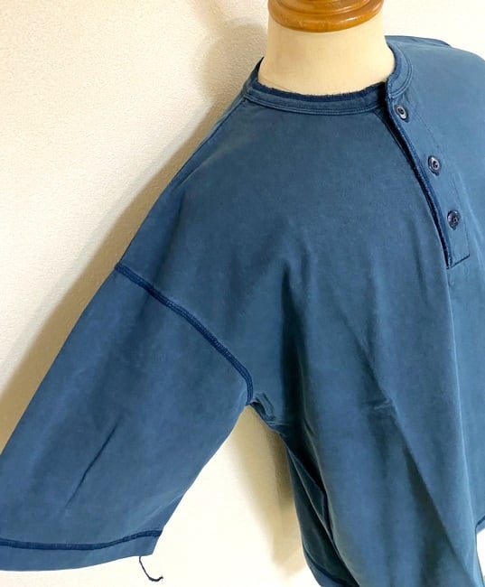 ピグメント染めとは、染料ではなく「顔料(ピグメント)」を使用して生地の表面に色をつけた加工を言います。その加工を施したヘンリーネックカットソー。