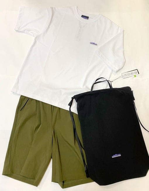 トップスの白TEEとショートパンツ、バッグの3点セット