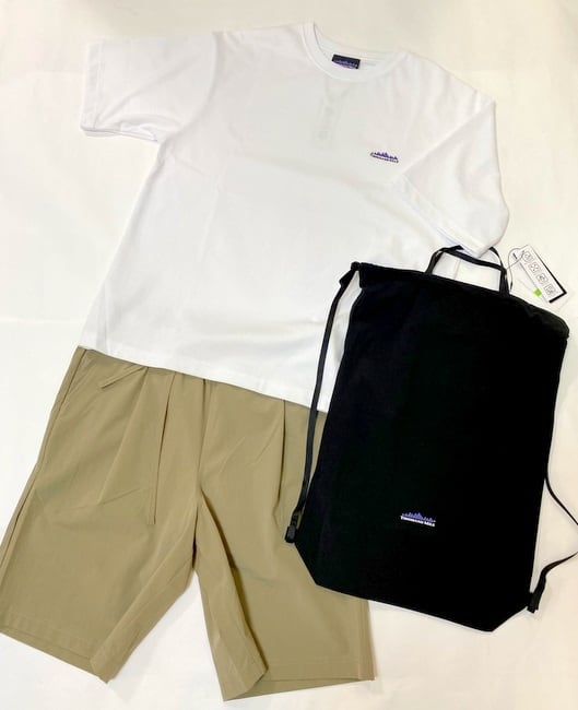 トップスの白TEEとショートパンツ、バッグの3点セット