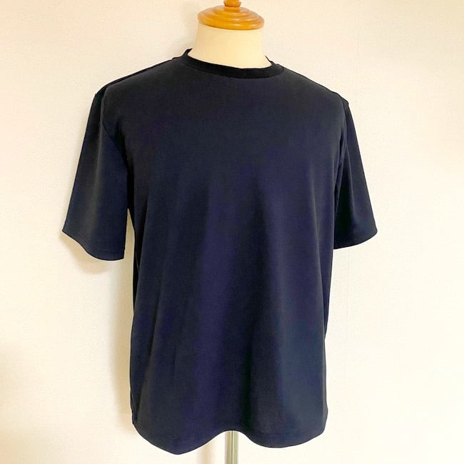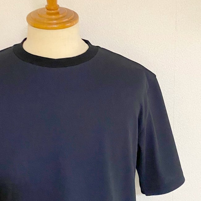 襟型はクロスになるようなクルーネックで別地のフライスで色合わせしています。