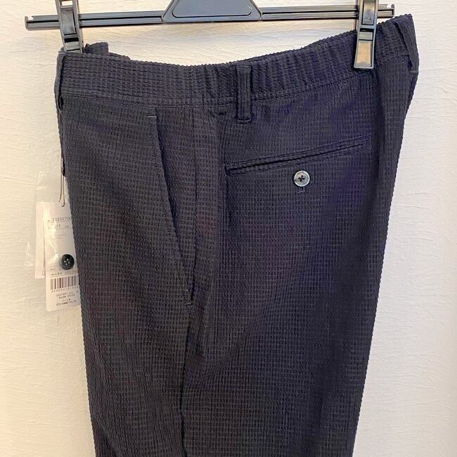軽さやストレッチ性など機能性も持ちあわせていて、様々なシーンで活躍します。スラックスはノータックのイージー型でウエスト周りにゴムを使用。スピンドルも配しているので、ベルトレスではくこともできます。超軽量で、涼やか!ノンストレスなサマースラックス