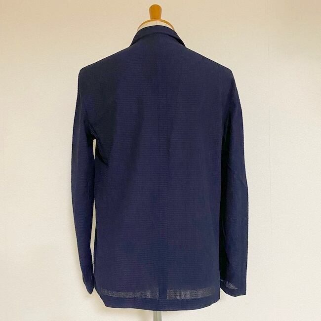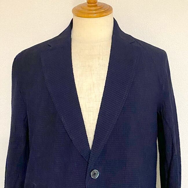 通常のメッシュやサッカー地などの凹凸よりもさらに深くボコボコした素材で 3D 感の強い見た目にインパクトのある特徴的な素材を使用したテーラードジャケット。