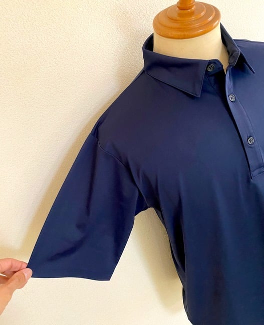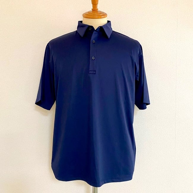地柄に細かい同色ラインの入った接触冷感素材を使用したポロシャツ。夏場でも快適に過ごせる機能素材はストレッチ性にも富んでいます。