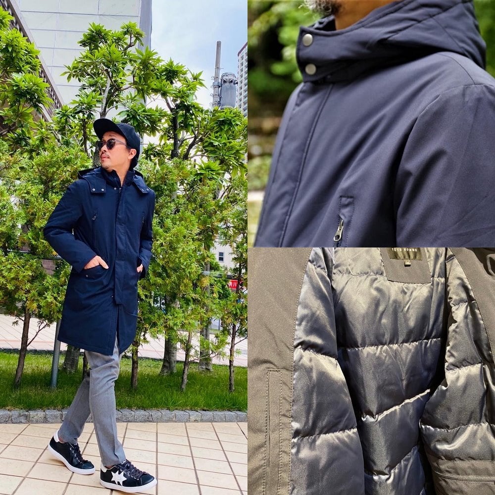 モッズコートのようなデザインをベースにして中綿にダウンを詰めたフーデッドコートに仕立てました。ダウンパックの縫い目は表面からは見えないようになっています。オンオフ両面で活躍するコート。