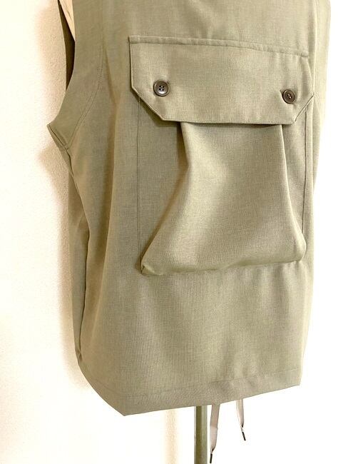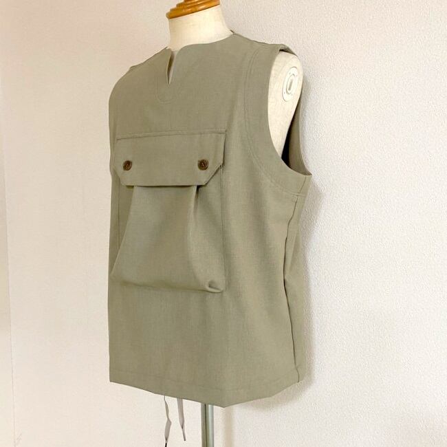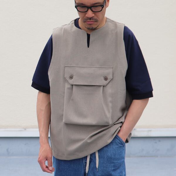 胸に付いたビックポケットがアクセントになる人気のキーネックプルオーバーベスト。