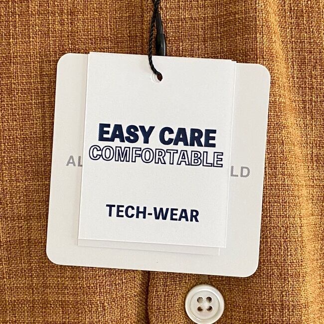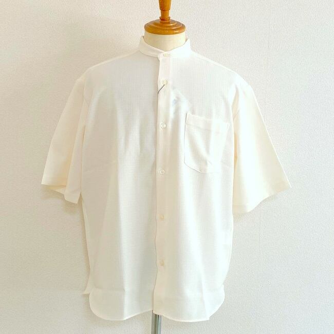 ワイドでリラックスした雰囲気のハーフスリーブ仕立てのバンドカラーシャツ。とろんっとした落ち感のある生地は速乾性、耐久性のあるテック素材で、生地の表面が天然素材のような織り地になっているのが特徴的。皺にもならずイージーケアな1枚。首周りがスッキリ、シャープに見えるシャツです。日本製。