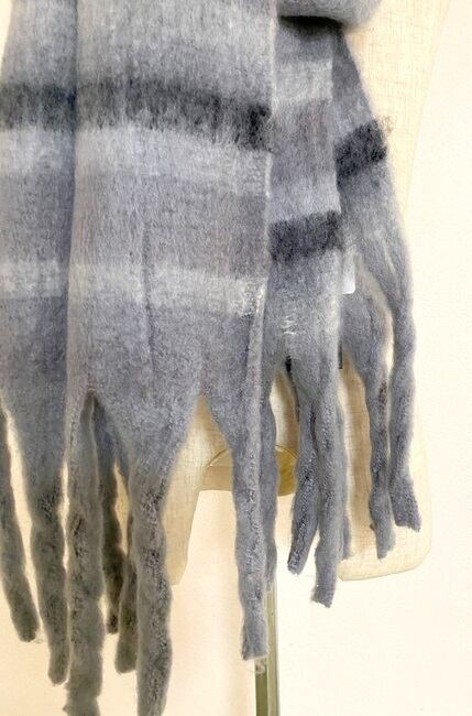 ふっくらとして柔らかな風合いと存在感のある長めのフリンジがスタイルの程良いアクセント。ウォームカラーを中心としたカラフルで色鮮やかなオレンジ、無彩色ながらも異なる明度の組み合わせでモノトーンとの相性が抜群なGRAYの2色展開。