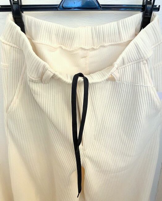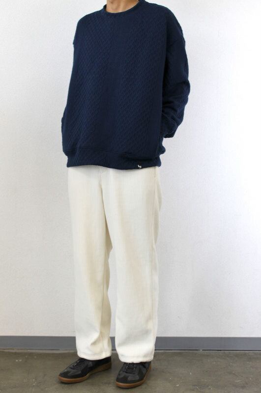 ソフトで柔らかく、肌触りの良いコーデュロイ風カットソー素材を使用したワイドパンツ。ウエストは総ゴムでイージー仕様ですが、ベルトループ、フロントにはファスナーもついています。裾の内側にはドローコードを配して、変化をつけての着用も可能です。