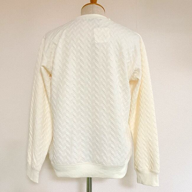 ヘリンボーン柄をジャガードで編みたてたニットライクなカットソー素材を使用しています。ネック、袖口、裾をリブ編みに切り替えて仕立てることでスウェットシャツのようなフォルムと着心地に仕立てています。スウェット感覚な気軽さでニット風のお洒落感をまとえるアイテム。