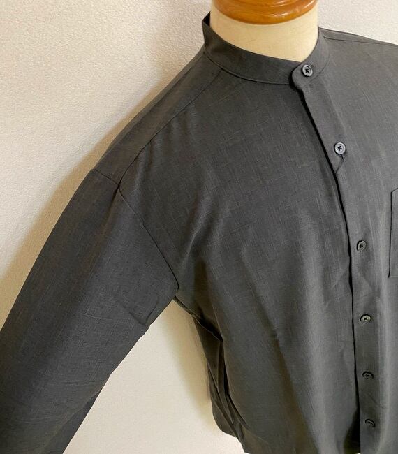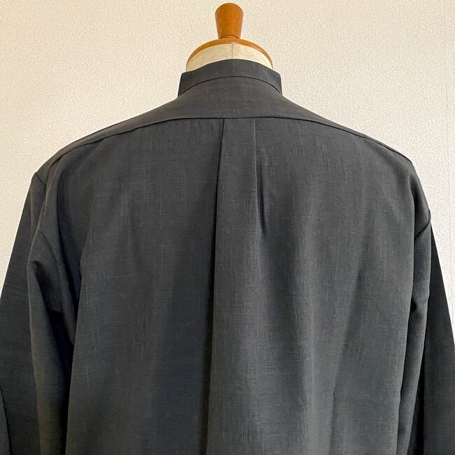 吸水速乾性等、多機能ポリエステル糸を使って霜降り調のムラのあるシャンブレーのように織り上げた生地が特徴的なバンドカラーシャツ。